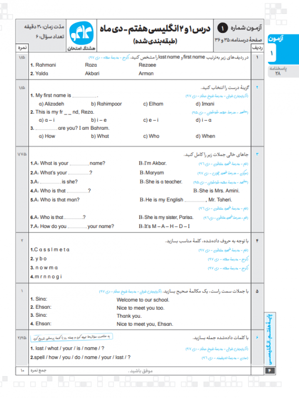 نمونه-کتاب- هشتگ امتحان- انگلیسی- هفتم
