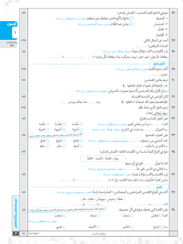 نمونهسؤالات واقعی میاننوبت و پایاننوبت مدارس کشور