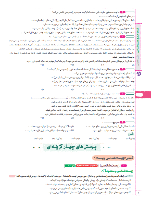 جلد اول تست پایه زیست شناسی دهم شامل درسنامه، تست، پاسخ تشریحی نیمسال اول پایه دهم (4 فصل اول کتاب) می باشد.